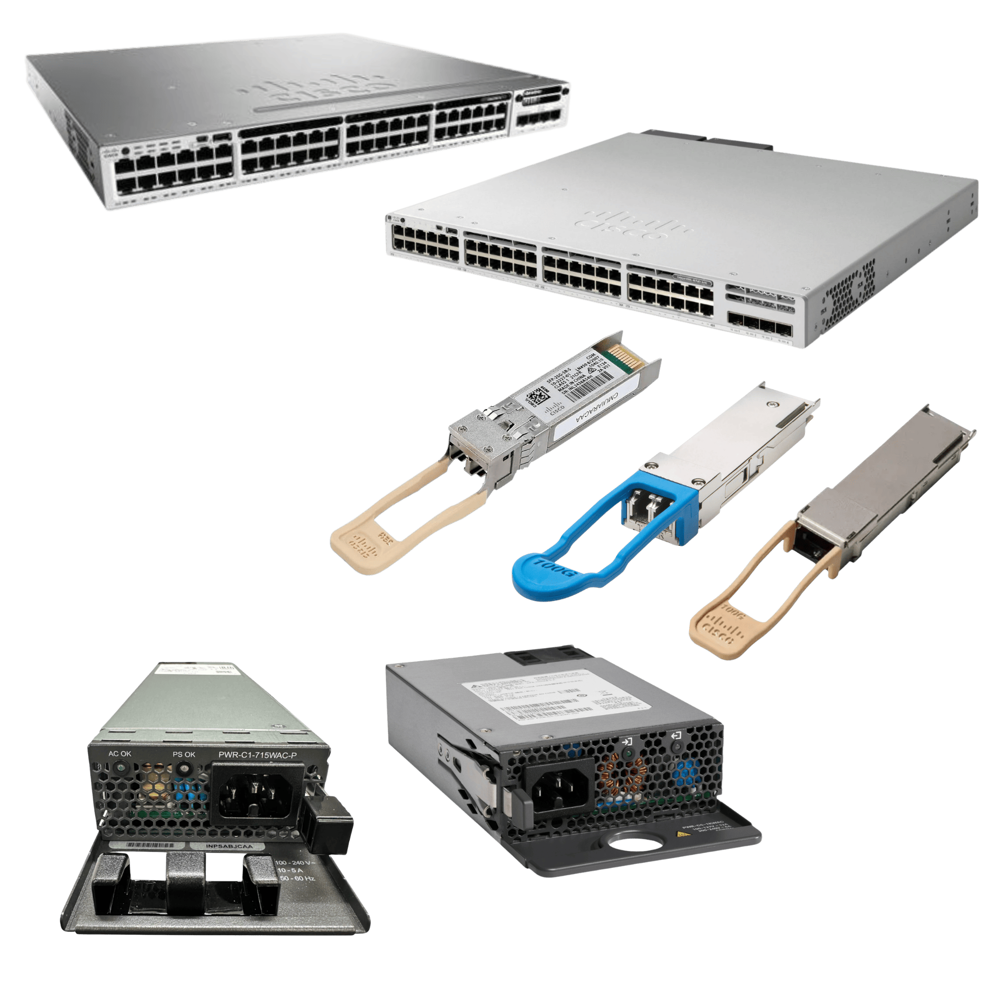 High-performance Cisco networking hardware: switches, power supplies, transceivers and more; fully tested and certified, with refurbished options!